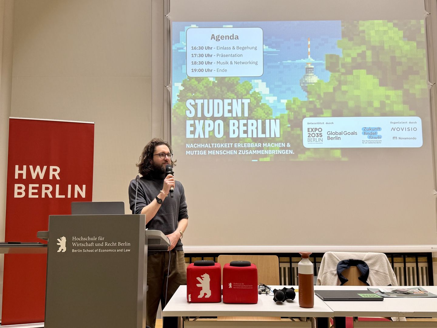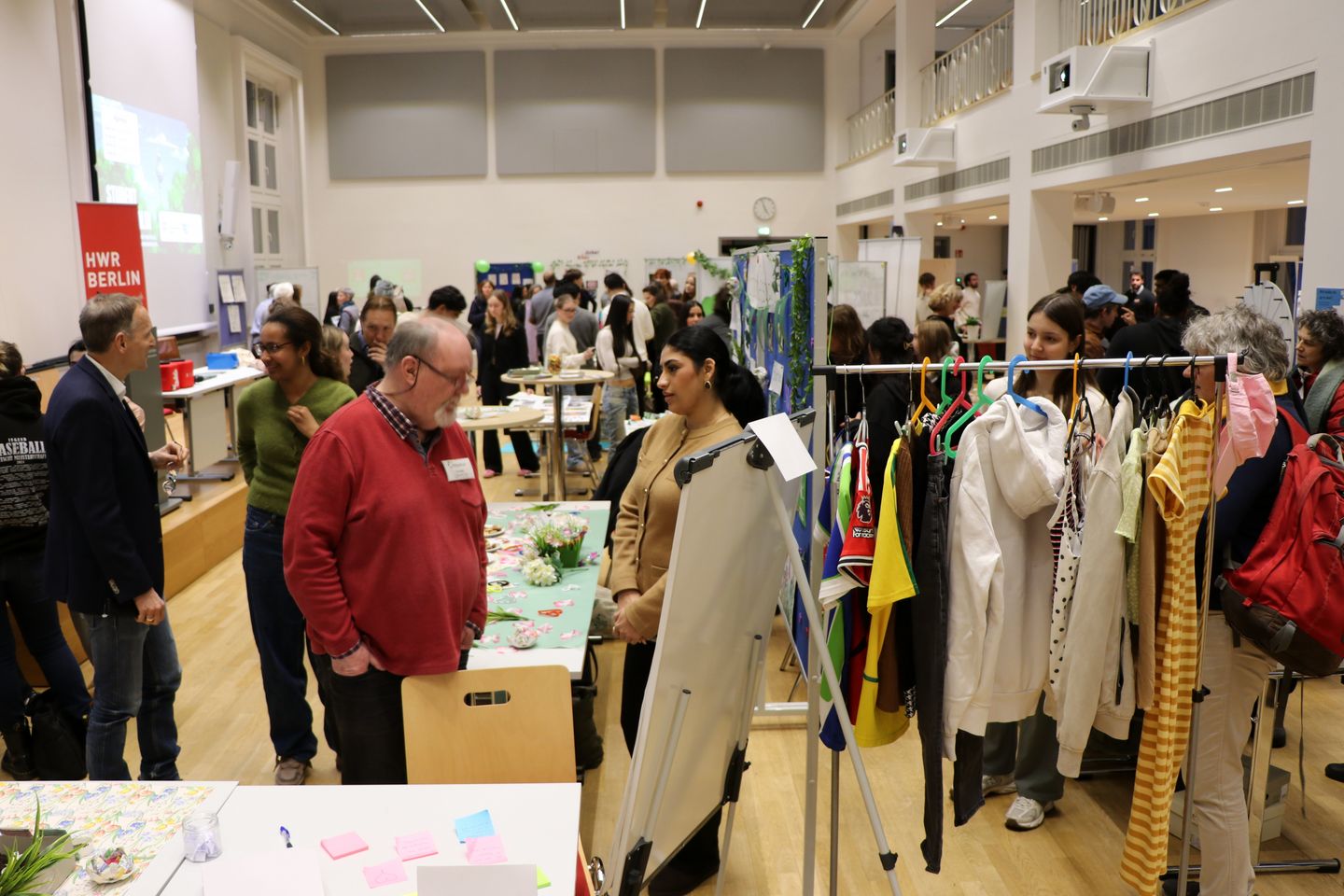 Im Januar 2026 wurde die Aula der HWR Berlin zur Bühne für Engagement, Kreativität und Begegnung: 67 Studierende des Bachelorstudiengangs Business Administration präsentierten im Rahmen des Projektmanagement-Kurses von Lehrbeauftragtem Felix Wieduwilt die Ergebnisse ihrer Recherchearbeiten zu Berliner Nachhaltigkeitsinitiativen.