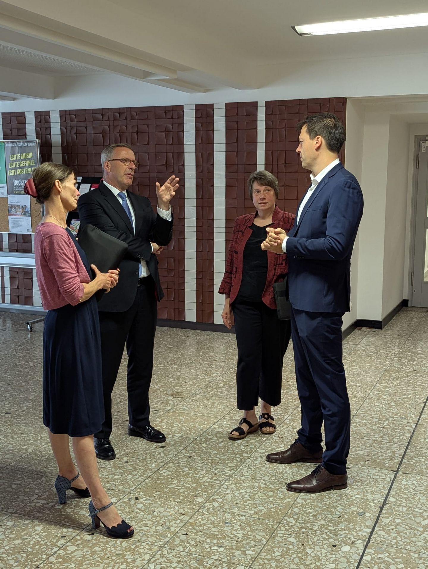 Im Rahmen seiner Sommertour zu den Berliner Hochschulen für angewandte Wissenschaften (HAWs) besuchte der Staatssekretär für Wissenschaft und Forschung, Dr. Henry Marx, den Campus Lichtenberg der Hochschule für Wirtschaft und Recht Berlin (HWR Berlin). Präsident Prof. Dr. Jens Hermsdorf, Vizepräsidentin Prof. Dr. Silke Bustamante und Kanzlerin Andrea Syring empfingen den Gast bei sommerlichem Wetter und stellten das besondere Profil der HWR Berlin heraus: Vollauslastung, stabile Studierendenzahlen und ein konsequenter Fokus auf praxisorientierte Forschung, Wissens- und Technologietransfer sowie gesellschaftliche Verantwortung.