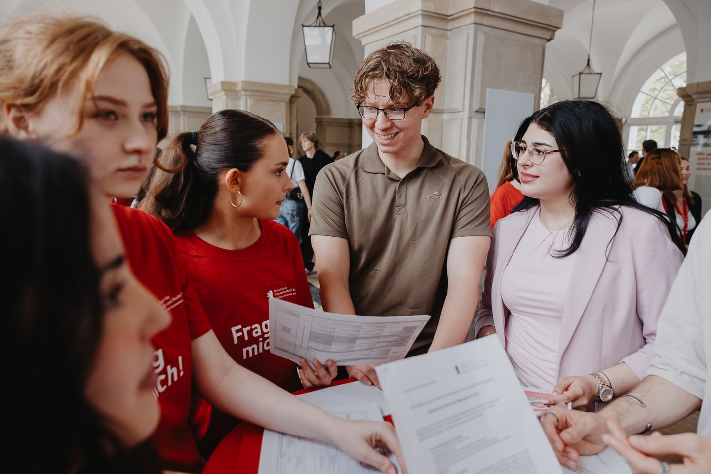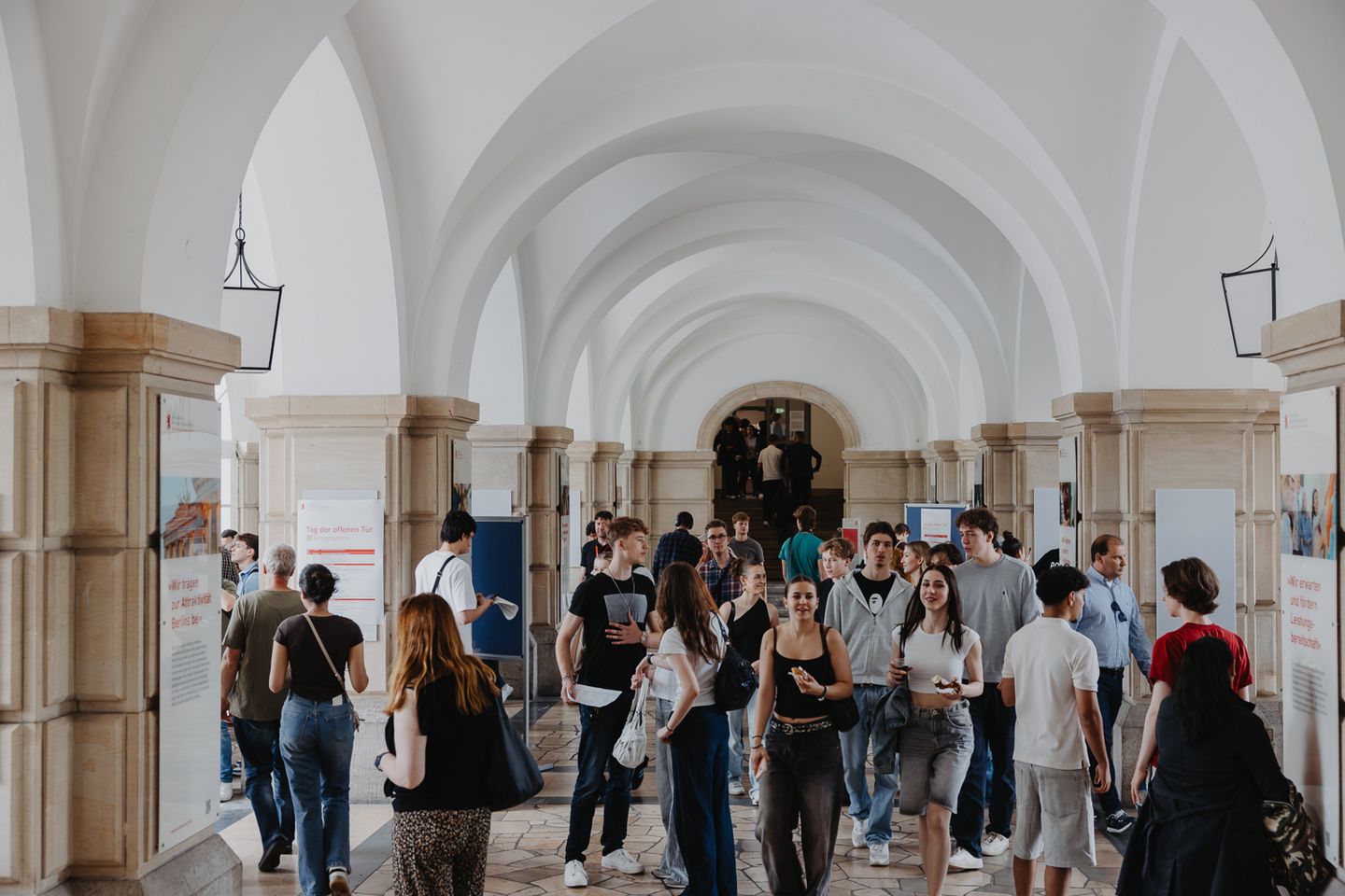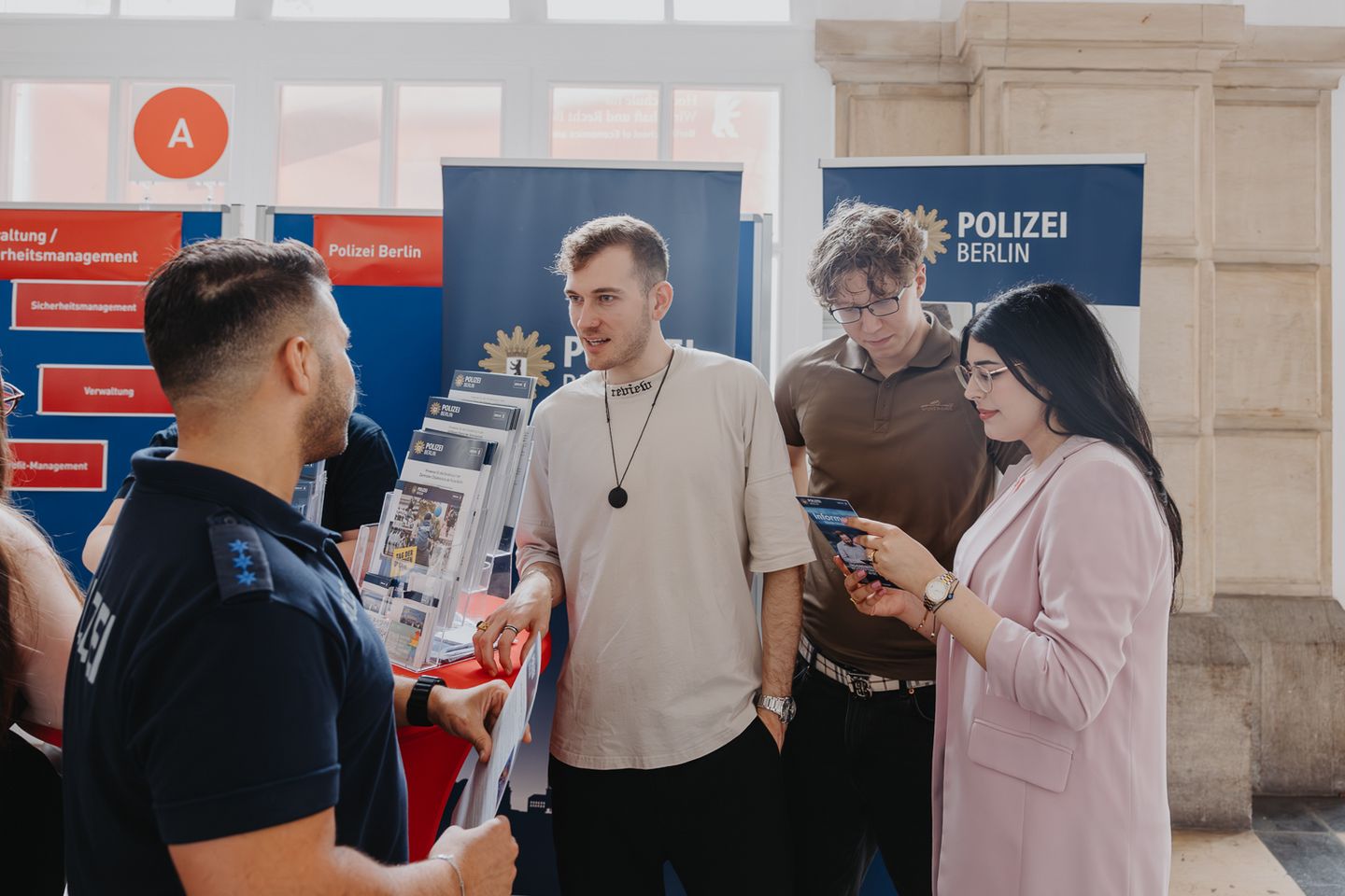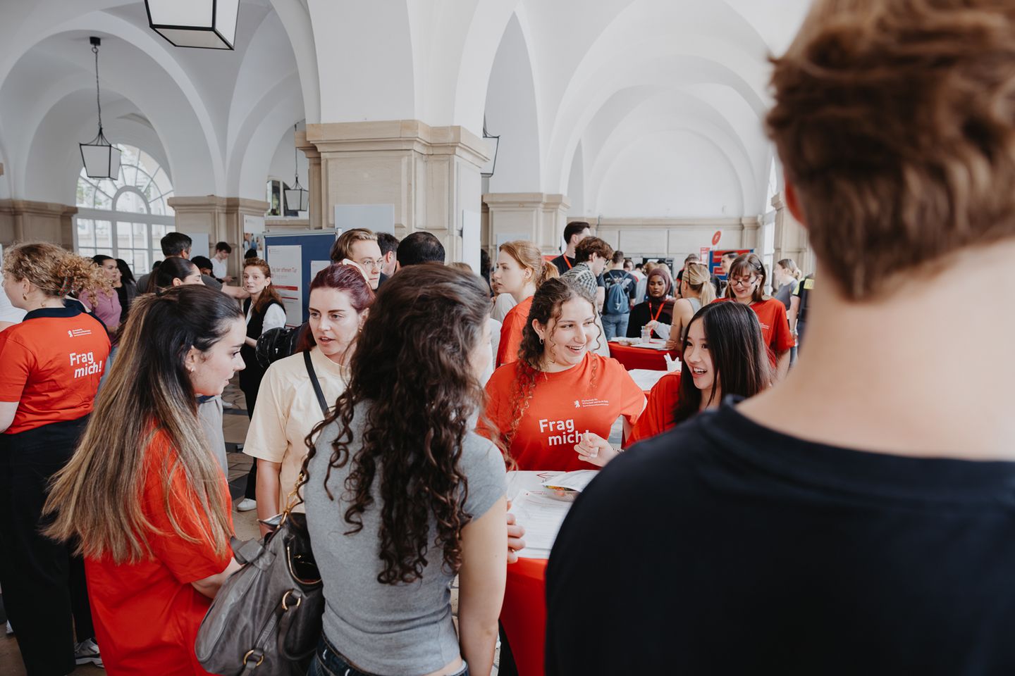 An zahlreichen Informationsständen nahmen sich Mitarbeitende aus der Studienberatung, den Studienbüros der Fachbereiche, dem International Office und dem Büro für Bewerbung, Zulassung und Immatrikulation ausgiebig Zeit, alle Fragen der Schülerinnen und Schüler beantworten. Ebenfalls vor Ort war das Recruiting-Team der Polizei Berlin, um den Bachelorstudiengang Gehobener Polizeivollzugsdienst zu bewerben.