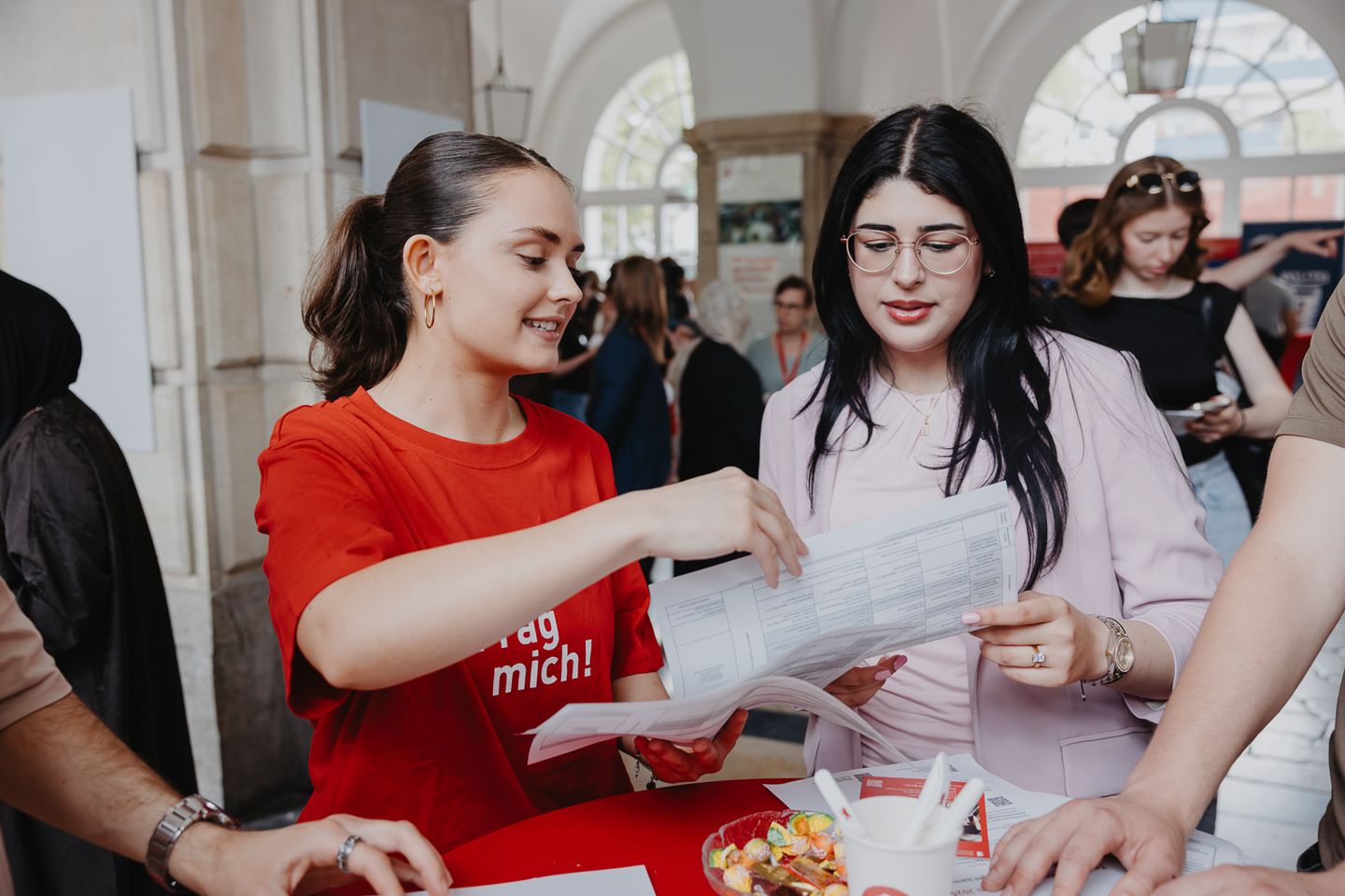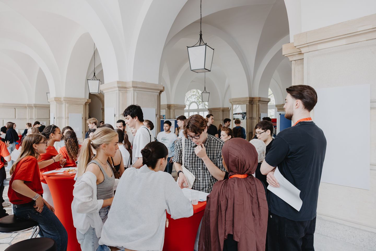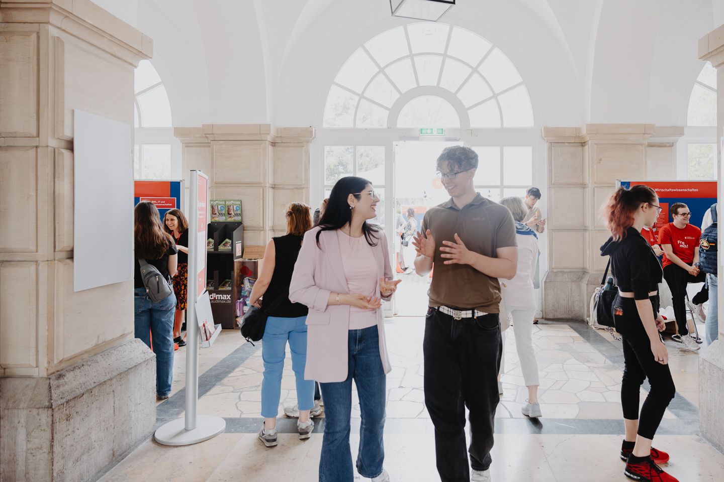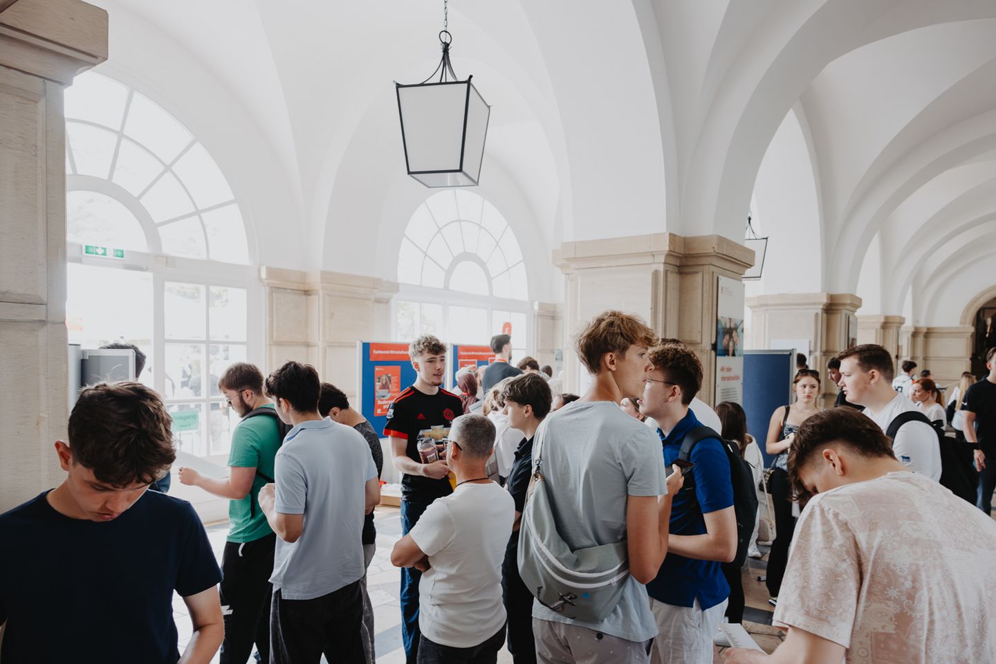 An zahlreichen Informationsständen nahmen sich Mitarbeitende aus der Studienberatung, den Studienbüros der Fachbereiche, dem International Office und dem Büro für Bewerbung, Zulassung und Immatrikulation ausgiebig Zeit, alle Fragen der Schülerinnen und Schüler beantworten. Ebenfalls vor Ort war das Recruiting-Team der Polizei Berlin, um den Bachelorstudiengang Gehobener Polizeivollzugsdienst zu bewerben.