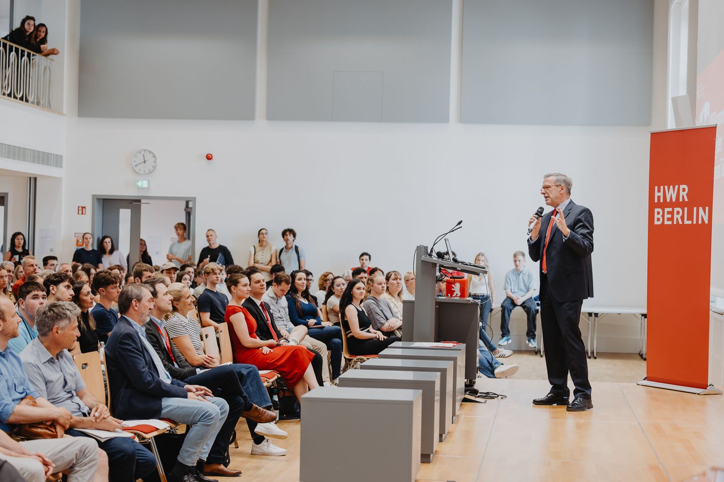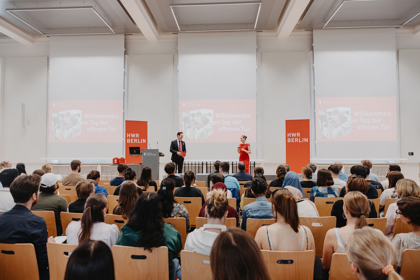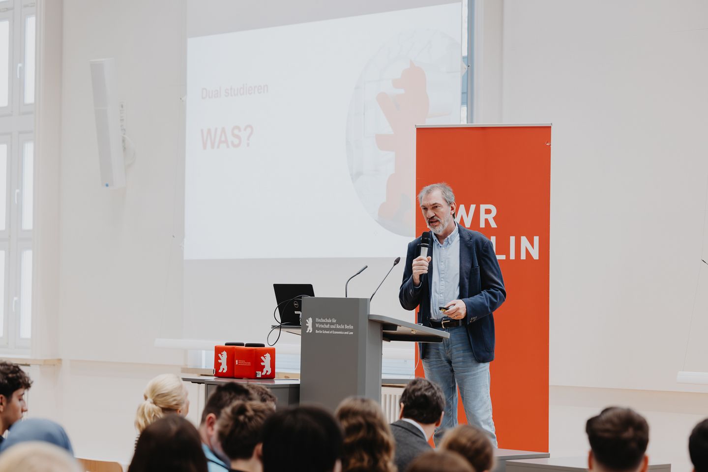 Parallel konnten sich die Besucher*innen in der Aula bei der Vorstellung der Studienbereiche einen ersten Eindruck vom breiten Portfolio der HWR Berlin verschaffen. Sehr gut besucht waren auch die Vorträge der Professorinnen und Professoren, die ihre Studiengänge in Kurzpräsentationen darstellten und Fragen beantworteten.