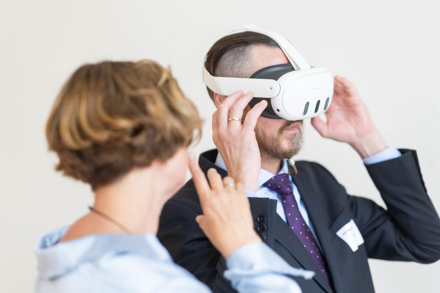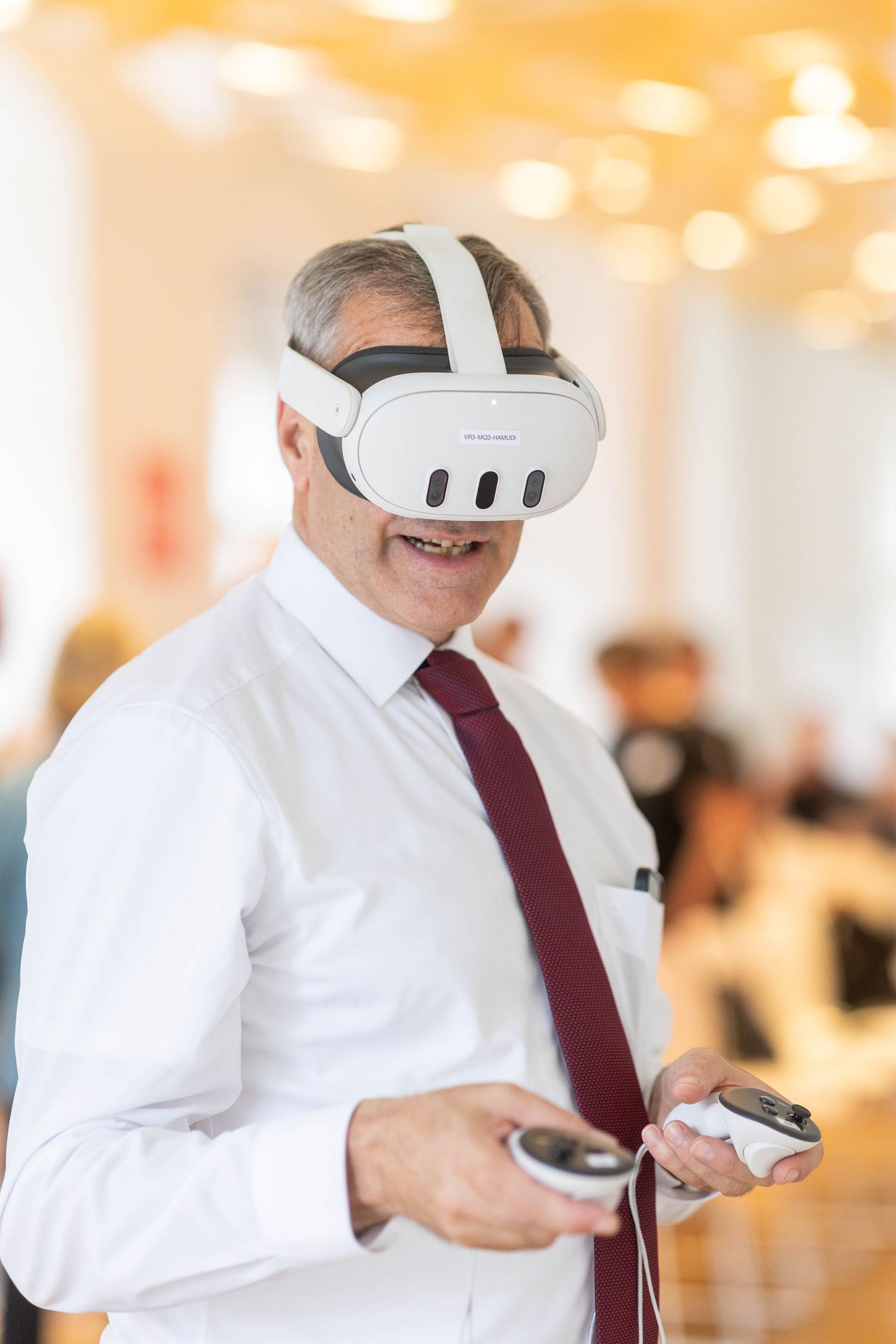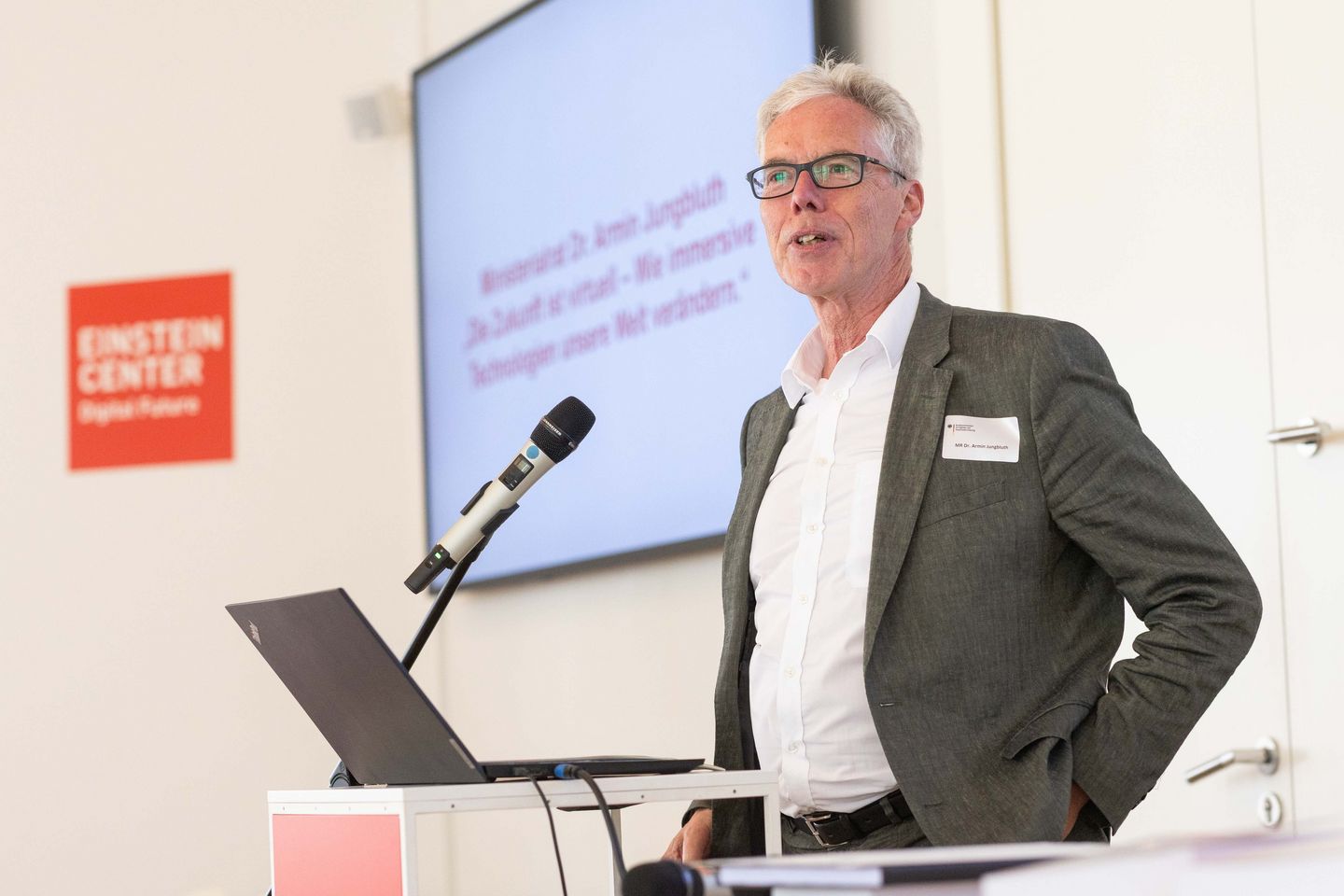 Ein inhaltlicher Höhepunkt der Veranstaltung war die Keynote von Dr. Armin Jungbluth, Ministerialrat im Bundesministerium für Digitales und Staatsmodernisierung. Unter dem Titel „Die Zukunft ist virtuell – Wie immersive Technologien unsere Welt verändern“ beleuchtete er die regulatorischen Herausforderungen und gesellschaftlichen Chancen immersiver Technologien aus politischer Perspektive.