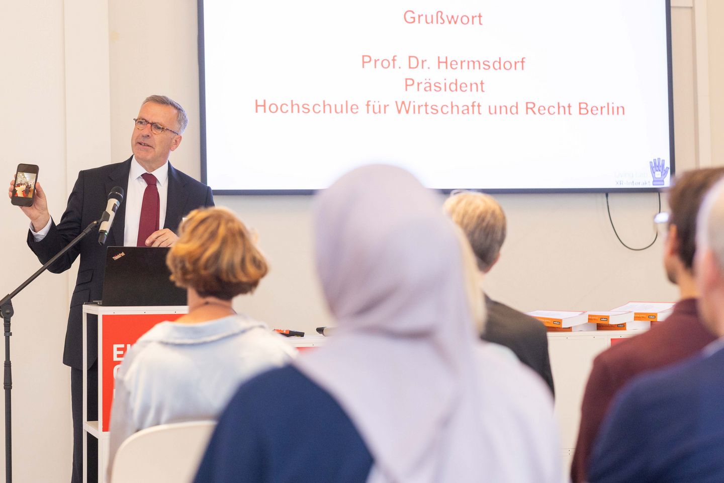 Ein Grußwort von Prof. Dr. Jens Hermsdorf, Präsident der HWR Berlin, hob die Rolle von Hochschulen für angewandte Wissenschaften im deutschen Forschungssystem hervor. Er betonte die Bedeutung der HWR Berlin als Akteurin im Spannungsfeld zwischen akademischer Lehre, praxisorientierter Forschung und gesellschaftlicher Verantwortung.