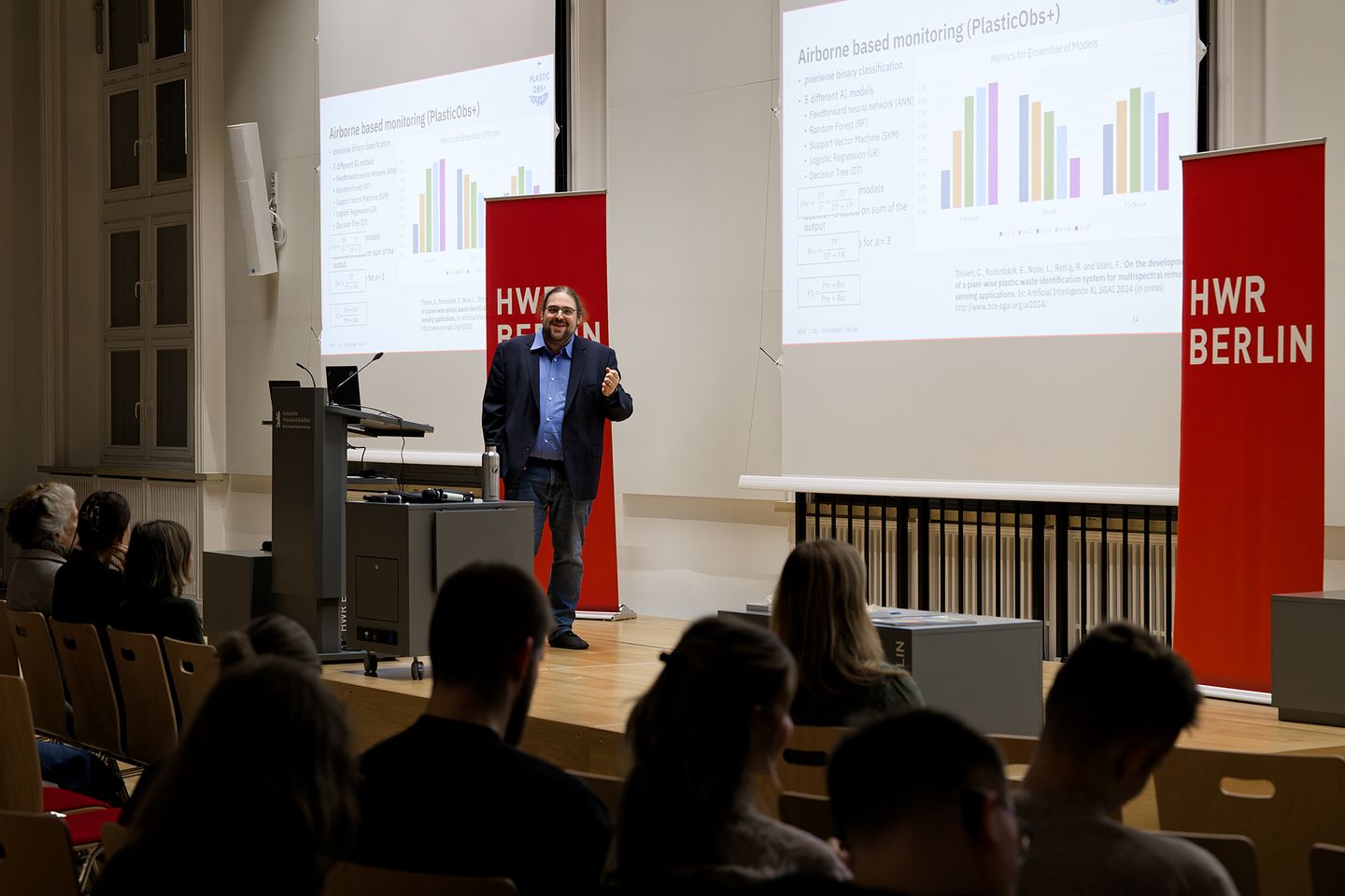 Dr. Christoph Tholen from the German Research Center for Artificial Intelligence (DFKI) in Oldenburg then demonstrated how artificial intelligence can be used to analyze images from research flights, allowing for large-scale studies of the type and amount of plastic waste in the oceans.