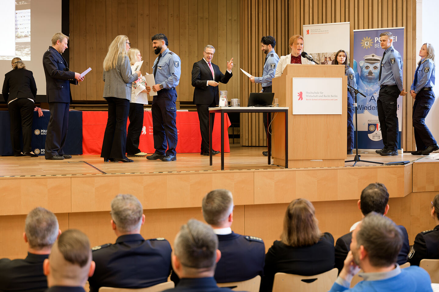 Zur Graduierungsfeier im voll besetzten Audimax der Hochschule für Wirtschaft und Recht Berlin (HWR Berlin) am Campus Lichtenberg kamen zahlreiche Gäste aus Politik, Polizei und Hochschule sowie Familienangehörige, um den Absolventinnen und Absolventen ihre Anerkennung auszusprechen und den erfolgreichen Abschluss gemeinsam zu feiern.