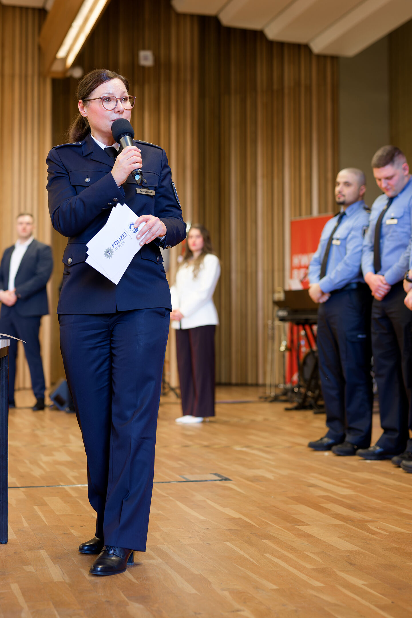 171 frisch ausgebildete Schutz- und Kriminalkommissarinnen und -kommissare sowie 13 Oberkommissar*innen mit Spezialisierung auf Wirtschafts- und Cyberkriminalität treten ihren Dienst bei der Polizei Berlin an. In ihrer Abschlussrede – ihrer „Lagemeldung“ – blickten die Absolventinnen auf drei intensive Jahre zurück: Das Studium sei fachlich, körperlich und persönlich herausfordernd gewesen. Sie hätten gelernt, dranzubleiben und durchzuhalten – „und wir haben es geschafft!“ Der Umgang mit Druck und Unsicherheit habe sie geprägt und seien sie als Jahrgang eng zusammengewachsen. Nun beginne ein Berufsleben, „in dem wir etwas leisten, was Bedeutung hat.“