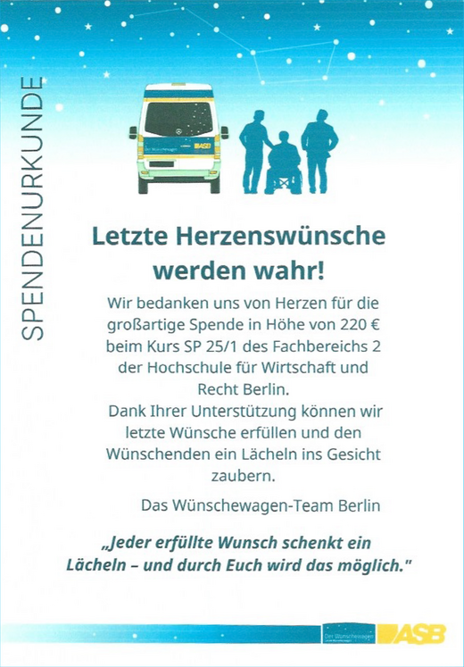 Dual Studierende der HWR Berlin sammelten in ihrer Vorlesung Kleingeld für den Wünschewagen des Arbeiter-Samariter-Bundes und erfüllten damit einem schwerkranken Menschen einen letzten Wunsch.