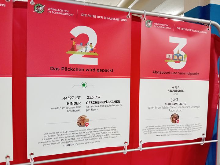 Unsere Unterstützenden fertigten in einer vierstündigen Schicht gemeinsam mit weiteren Ehrenamtlichen rund 2.500 Schuhkartons für den Versand an. In der ersten Woche der Aktion packte das Team in drei Schichten pro Tag bereits 58.361 Kartons. Die Aktion läuft bis kurz vor Weihnachten weiter.