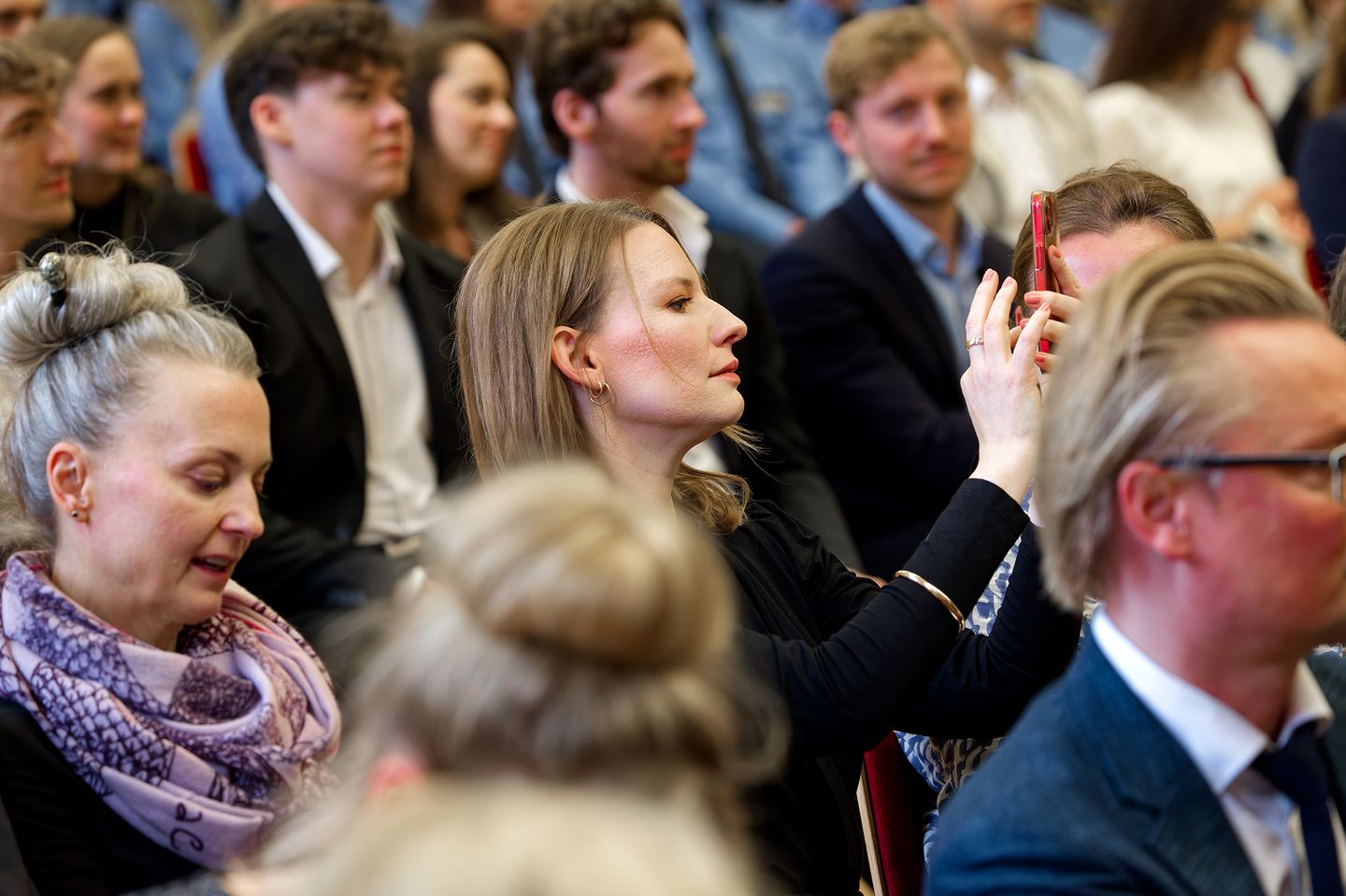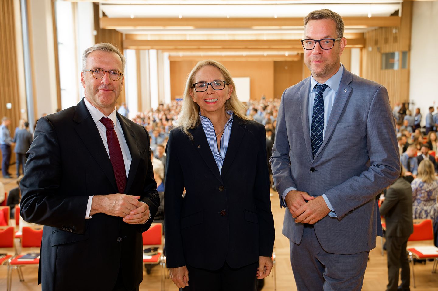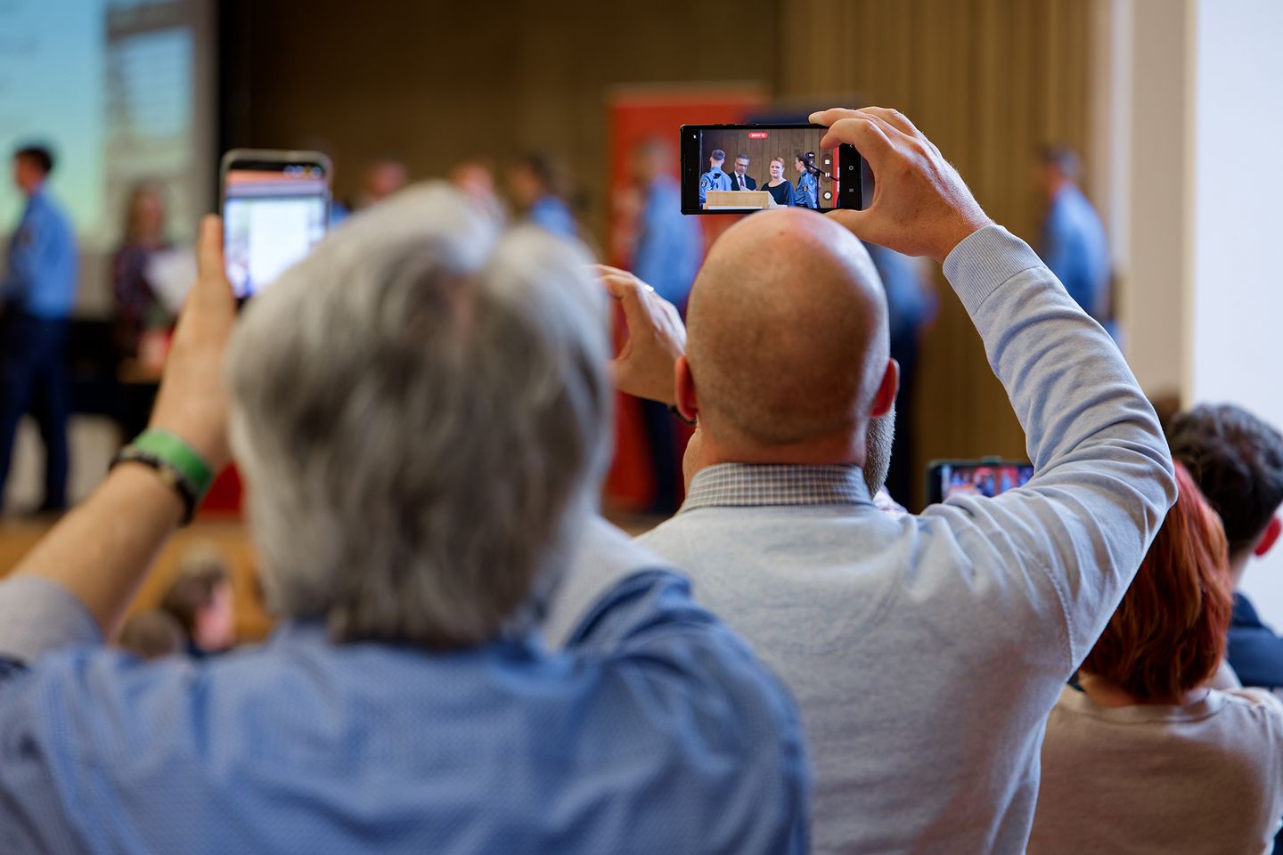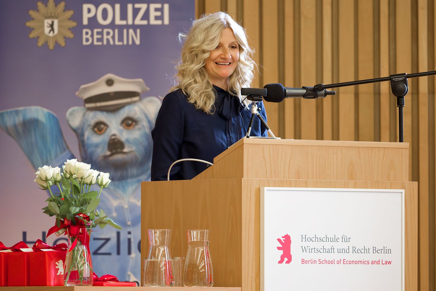 Prof. Dr. Janine Neuhaus, Pro- und Studiendekanin des Fachbereichs Polizei und Sicherheitsmanagement, begrüßte die Gäste im bis auf den letzten Platz besetzten Audimax. Gemeinsam mit dem Präsidenten der HWR Berlin, Prof. Dr. Jens Hermsdorf, beglückwünschte sie die Absolvent*innen zu ihrem erfolgreichen Studienabschluss. Hermsdorf dankte in seiner Ansprache den Absolvent*innen für ihren zukünftigen Einsatz und bezog dabei den Familien- und Freundeskreis ein, die mit ihrer Unterstützung und Rückendeckung eine besondere Rolle im Leben der Kommissar*innen einnehmen.