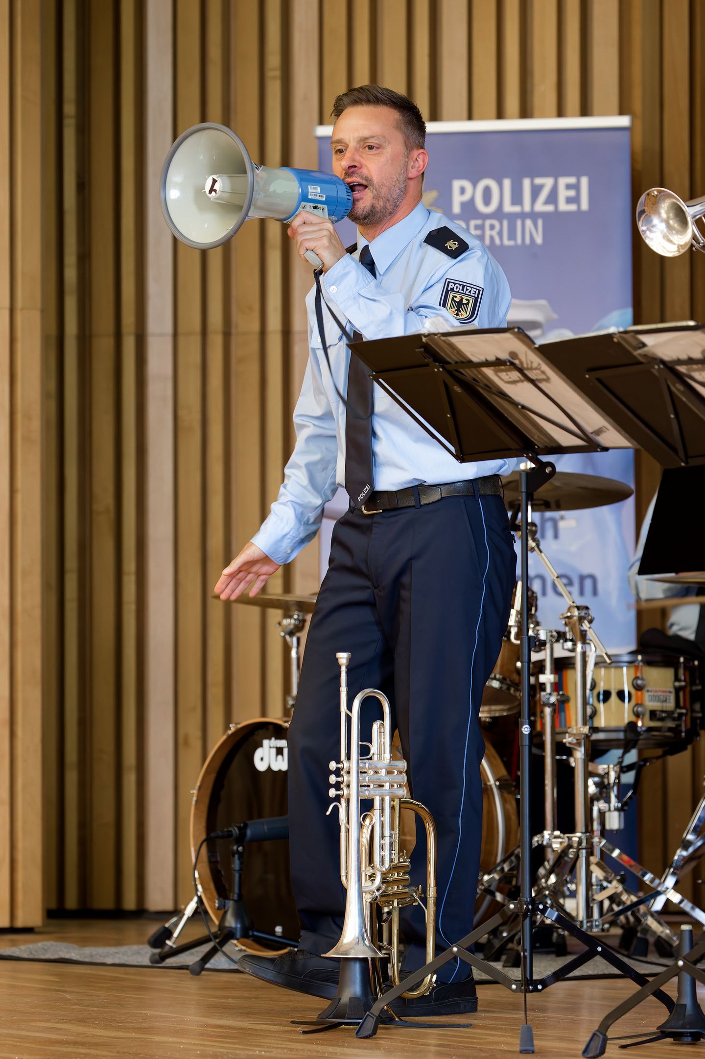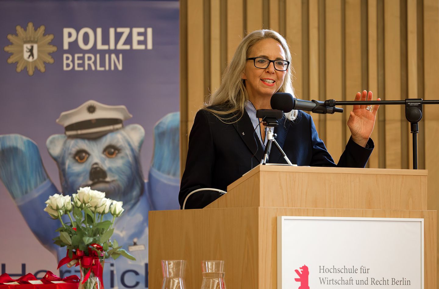 Besonders hervorzuheben ist die studentische Abschlussrede, die zwei Absolvent*innen der Schutzpolizei hielten. Sie schlossen ihre Ansprache mit einem Zitat der kürzlich verstorbenen Berlinerin Margot Friedländer, das mit der berühmten Botschaft „Seid Menschen!“ endet und die Absolvent*innen dazu aufruft, jederzeit und besonders in der aktuellen - von menschenrechtsverletzenden Taten auf der ganzen Welt geprägten - Zeit für die demokratische Grundordnung einzustehen und diese zu schützen.