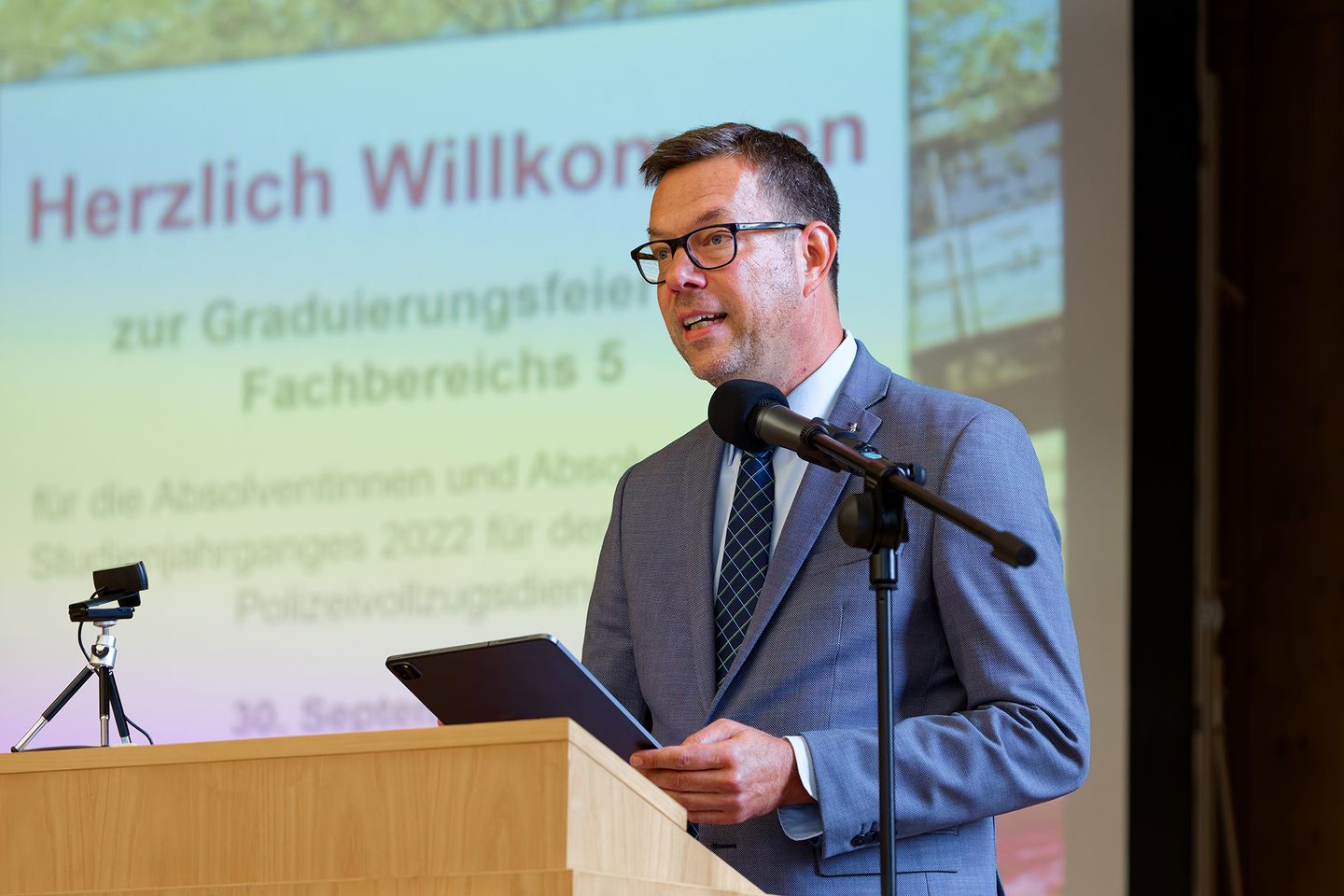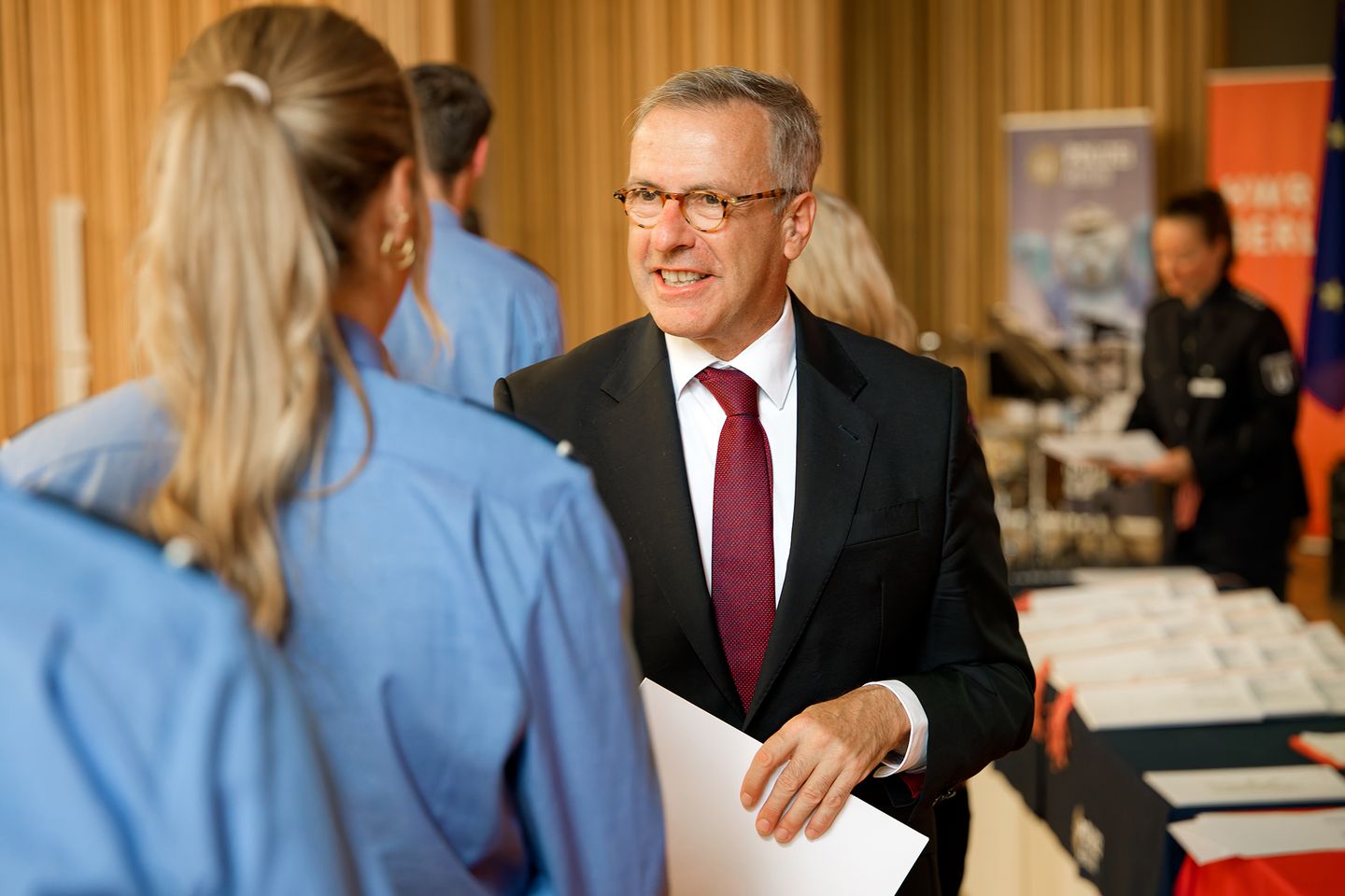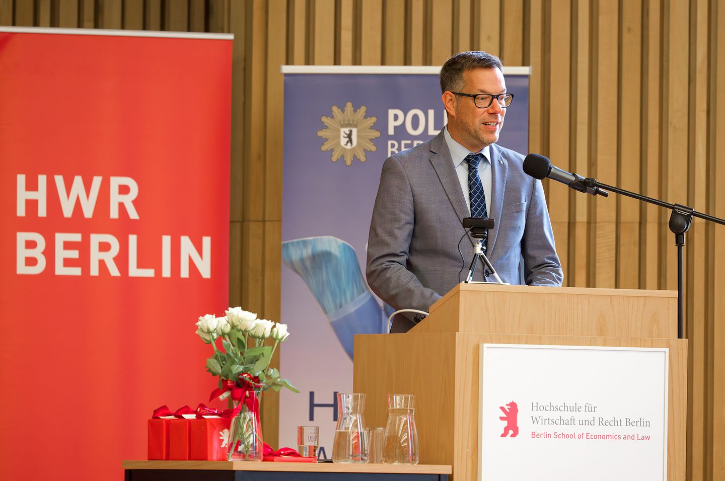 Der Staatsekretär für Inneres der Senatsverwaltung für Inneres und Sport: „Es endet ein dreijähriges Studium. Es beginnt ein neuer Lebensabschnitt. Sie haben diesen großartigen Erfolg erreicht. Dazu gratuliere ich jedem einzelnen von Ihnen von Herzen.“