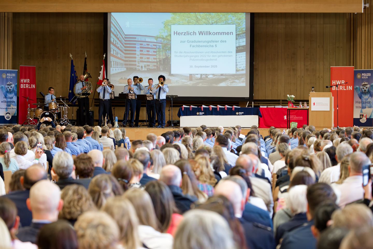 Am 30. September 2025 fand die feierliche Graduierung und Ernennung der Absolvent*innen des Studienjahrgangs Wintersemester 2022 im Audimax am Campus Lichtenberg der HWR Berlin statt. Die Heavy Brass Band des Bundespolizeiorchesters heizte den Anwesenden ordentlich ein und begleite die gesamte Veranstaltung mit musikalischen Einlagen.