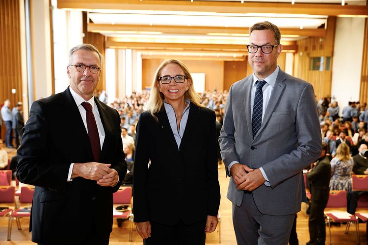 Zur Urkundenübergabe und Feierstunde im voll besetzten Audimax der Hochschule für Wirtschaft und Recht Berlin kamen zahlreiche Gäste aus Politik, Polizei und Hochschule: HWR-Präsident Prof. Dr. Jens Hermsdorf, Polizeipräsidentin Dr. Barbara Slowik Meisel, Staatssekretär für Inneres Christian Hochgrebe (v.l.n.r.) Foto: Manfred H. Vogel